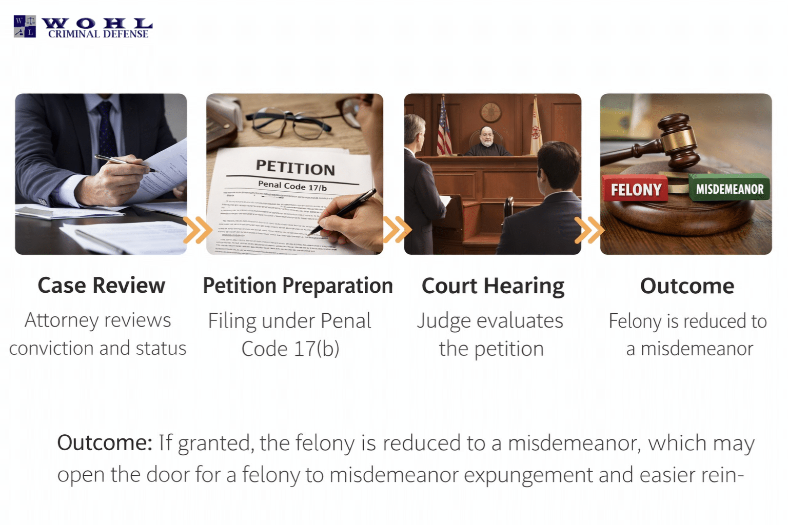 In general, this process allows eligible defendants to have certain felony convictions lowered to misdemeanors, offering legal relief, potential probation instead of jail time, and a better chance at criminal record relief.